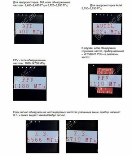 | Прибор имеет 3 диапазона | 2.4-2.5ГГц, 4.9-6.0ГГц - частоты квадрокоптеров (отклик на сигнал моментальный), 1080-1470МГц - частоты видеолинка FРV дронов + частоты модулей Таysinс viulinх (был замечен на дроне Баба-Яга) (отклик на сигнал моментальный). |